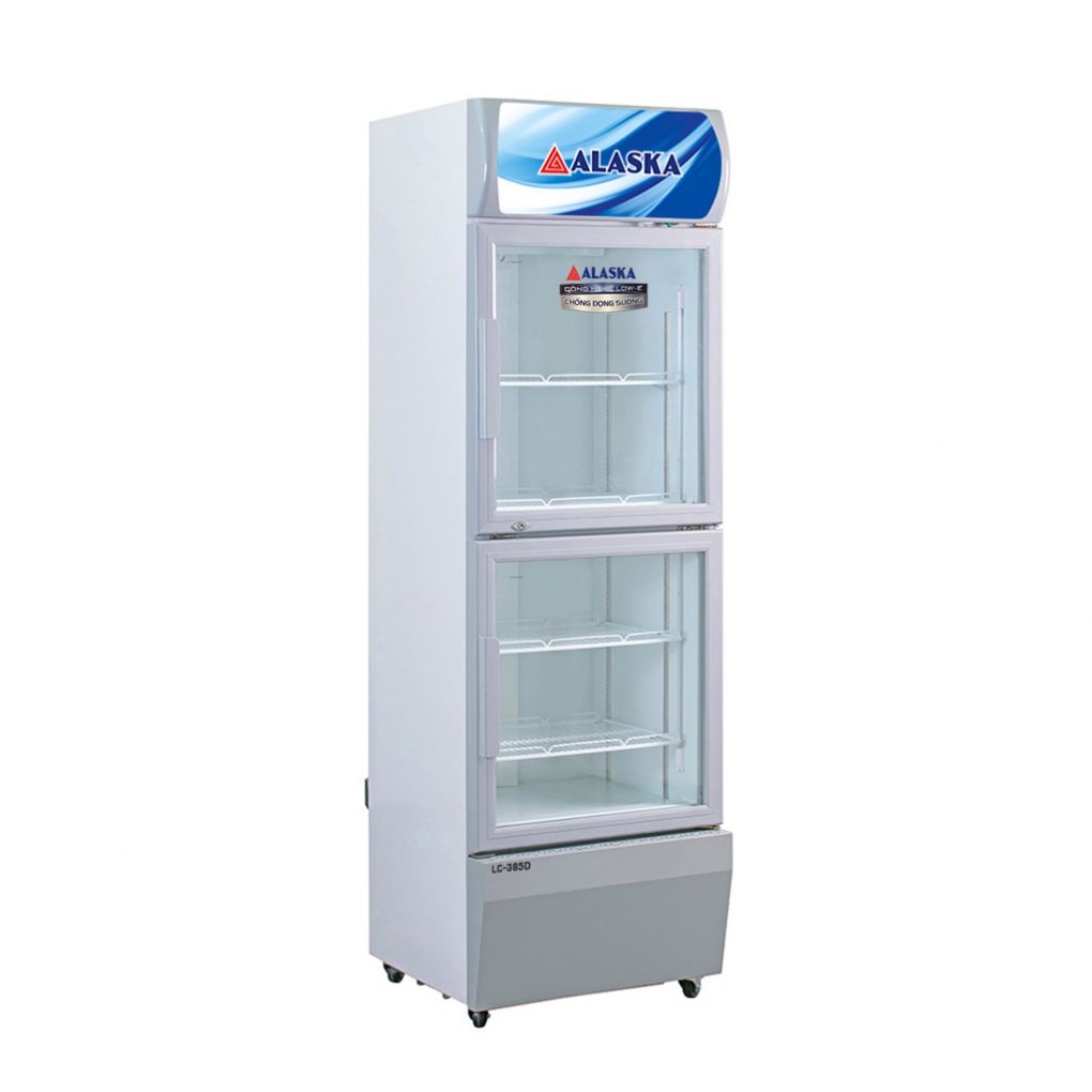- Tủ mát Alaska LC-385D là dạng tủ mát cỡ lớn, dung tích tổng 450 lít, sử dụng 382 lít có thiết kế 2 cửa trên – dưới mở ngang, kính 2 lớp hút chân không công nghệ low-e giúp giữ nhiệt tốt, có sấy kính.
