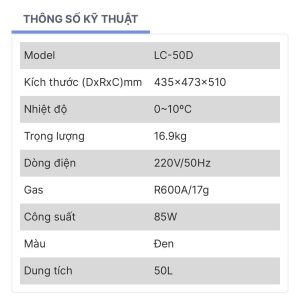 LC-50 sử dụng loại gas R600a an toàn với tất cả các loại thực phẩm, kháng khuẩn tốt, giữ lạnh sâu. Sản phẩm gồm 2 màu: đen và trắng để người dùng lựa chọn và sử dụng.